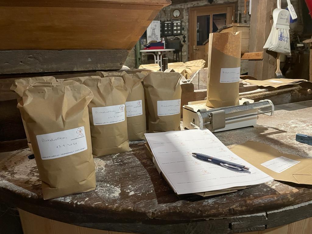 Baking bran and wholemeal flour are created and distributed to small customers, visitors, neighbors and well-wishers. The requirements of non-profit status are taken into account.