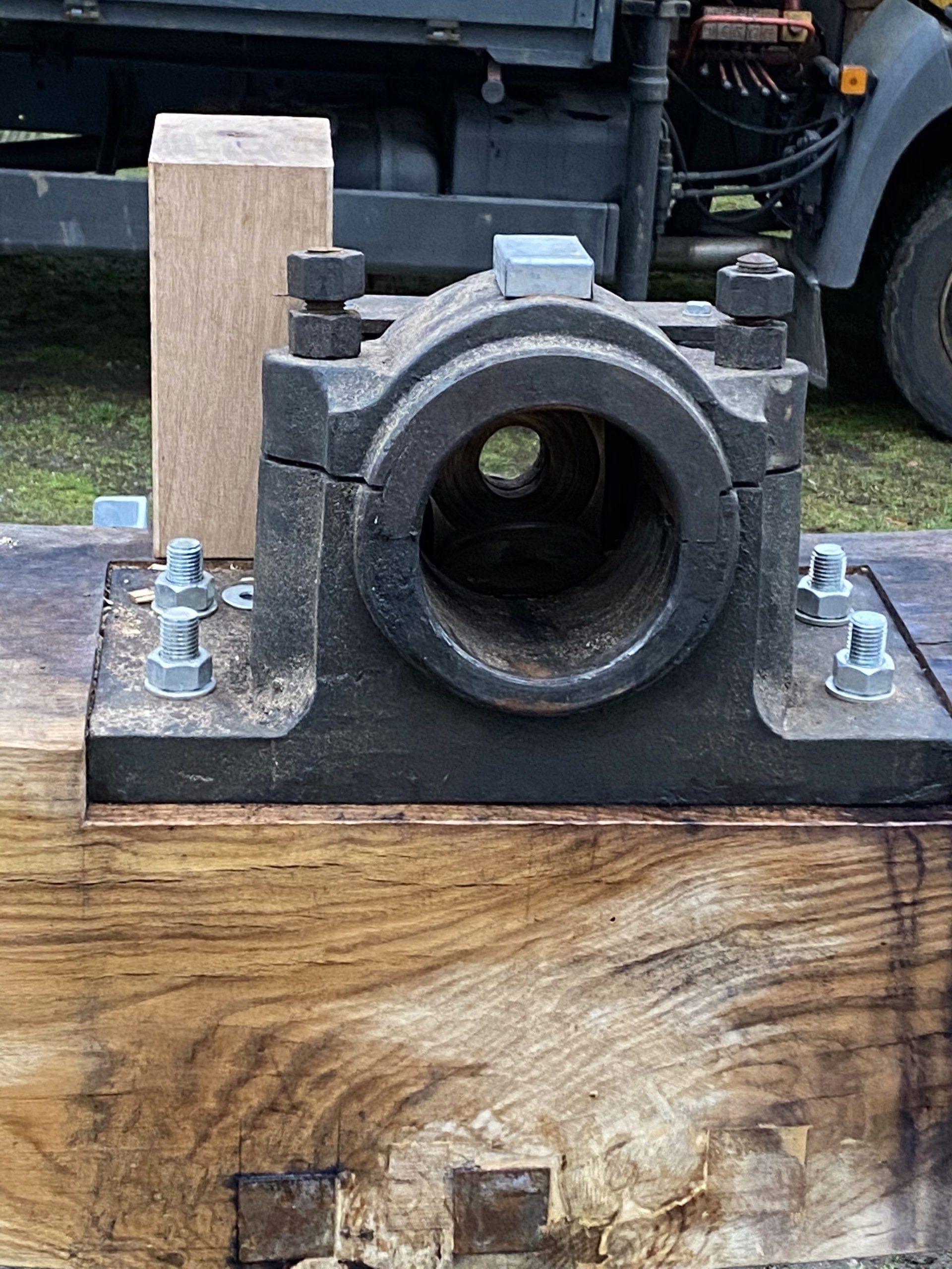Nach Anlieferung des Steins vor Weihnachten hatten wir ihn erst auf dem Steinboden aufgerichtet, an die richtige Stelle gerollt, in den Kran eingehängt, abgezirkelt und die Lager für die Balancierhaue bis auf weniger als 1mm genau ausgerichtet und eingegipst.